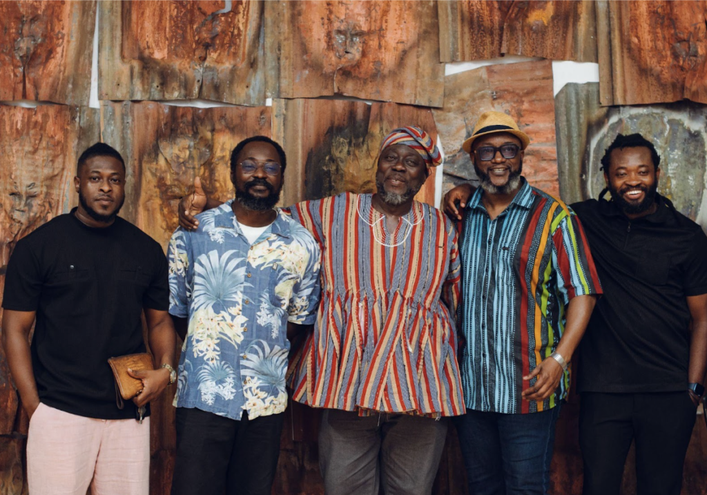 Photo from the opening reception of blaxTARLINES co-founder, Edwin Bodjawah’s solo exhibition Zado Keli: Eclipse of a Continent? (From left: Kelvin Haizel, Kwasi Ohene-Ayeh (curator of the exhibition), Edwin Bodjawah, George Buma Ampratwum, Hassan Issah) Photograph: Daniel Mensah Boafo